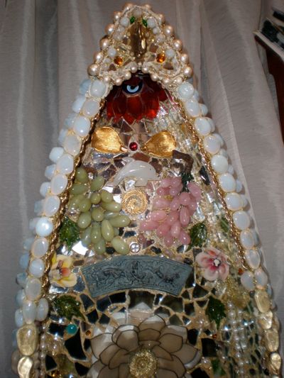 Common vintage objects such as vintage wooden sconces, rolling pins and wooden spoons are preserved, sanctified, and transformed, being adorned with mirror, jewelry, icons, shells, stones, beads, vintage and re-cycled treasures along with newer ingredients... all a reminder of how the ordinary can be extraordinary, and that nourishment and inspiration come in many forms.