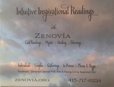 Licensed and screened by Cori in Salem, MA, Zenovia has been giving readings for over three decades and is also Certified in: Hypnotherapy, Energy Healing, Aromatherapy, Bodywork, and as an end of life Doula. She is an Artist, Ordained Minister and Priestess, and believes that we all have the capacity to transform multi-dimensionally if we so choose, for the highest good of all with harm to none.
